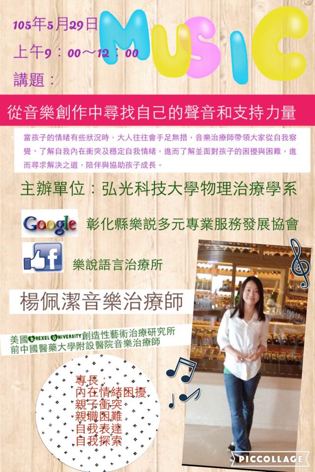 Music Therapy with An Adolescent Diagnosed with Depression Disorder 1 Emotional Disorders 2. 由楊佩潔音樂治療師帶領的 在彰化的朋友有興趣的快來參考一下 日期 2017年9月24日週日 時間上午1000-1200 地點國立彰化師範大學彰化市進德路1號綜合中心地下一樓-創思坊 對象 一般社會大眾助人專業者與相關科系學生以及家長. 時間下午14001700 3小時 地點崇友文教基金會 台北市公園路30號10樓 人數限額30名.